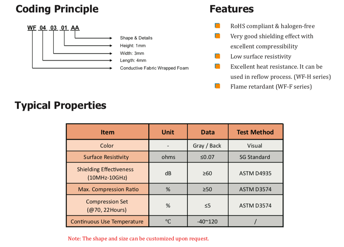 首頁(yè) > 產(chǎn)品 > EMI/EMC 材料 > EMI屏蔽和接地墊片 > WF系列導(dǎo)電布包裹泡棉